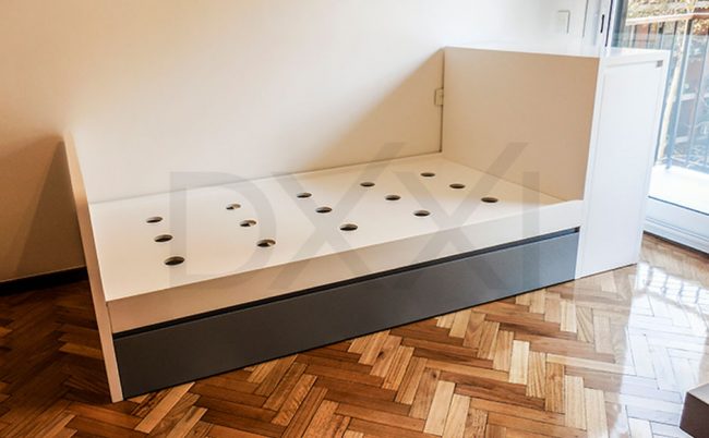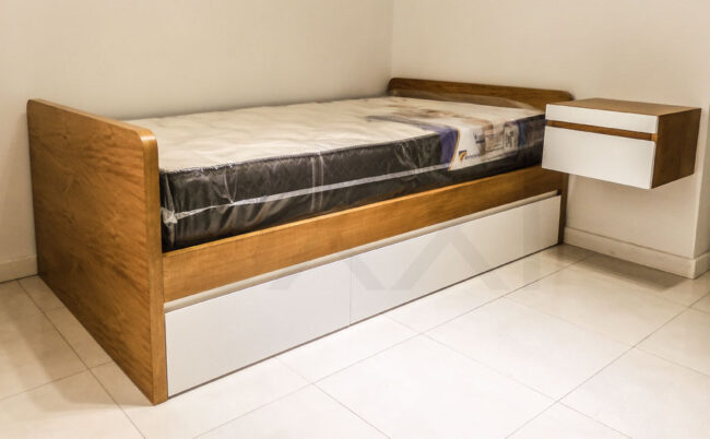 Fabricamos camas funcionales con cajones para todos los tamaños de colchones disponibles en plaza, tanto en MDF laqueado semi mate o brillante como en madera enchapada en Guatambú con terminación poliuretánica natural o de cualquier tono de madera. La estructura es robusta y esta sobre dimensionada para aguantar cualquier peso. Los cajones se accionan con correderas telescópicas importadas de alta resistencia.