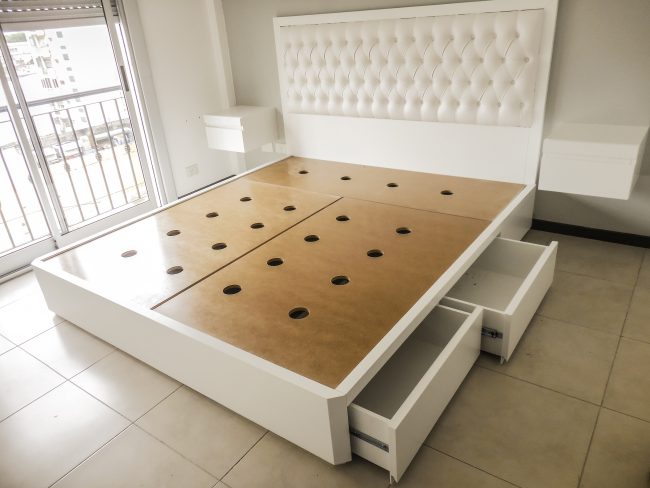 Diseñamos y fabricamos respaldos de cama modernos de primera calidad. Usamos tanto MDF laqueado semi mate o brillante, como madera enchapada y maciza en Guatambu o Paraíso. La terminación empleada es lustre poliuretánico tono a definir. Ofrecemos tapizados con tela en distintos colores, podes elegir el tuyo personalizado.