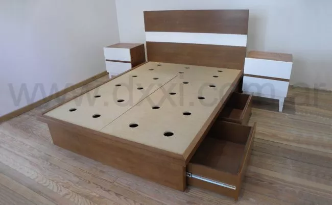 | Materiales | Cuerpo en MDF laqueado semi mate blanco, negro, gris o chocolate, frente de cajones en madera enchapada en Paraiso con lustre poliuretánico poro abierto color a definir y estructura de apoyo de madera maciza Paraiso con lustre poliuretánico color a definir. |