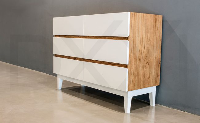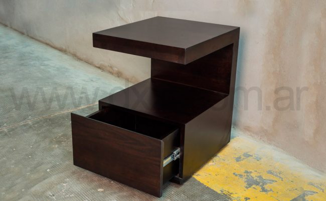 Mesa de luz con estructura de madera maciza Guatambu y cuerpo enchapado con terminación poliuretánica. Tiene un cajón amplio y otro oculto con organizador y cerradura.