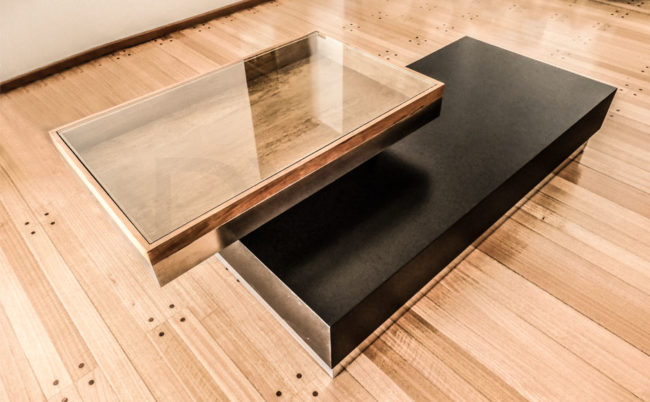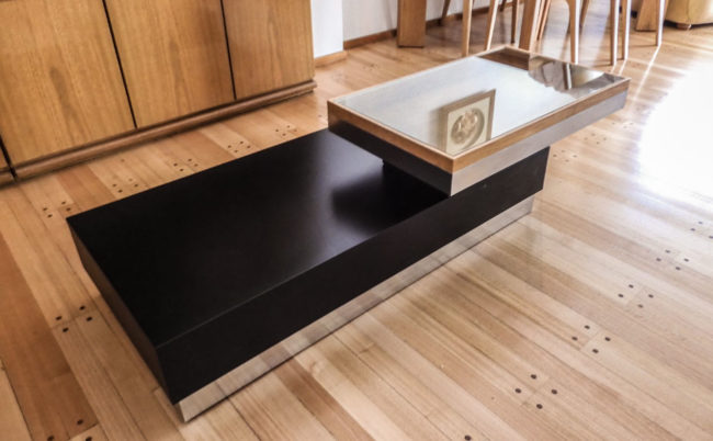 Mesa ratona funcional con tapa levadiza y espacio de guardado. Estructura de apoyo de madera maciza con terminación poliuretánica, cuerpo y tapa de MDF laqueado semi mate. Ideal para espacios reducidos